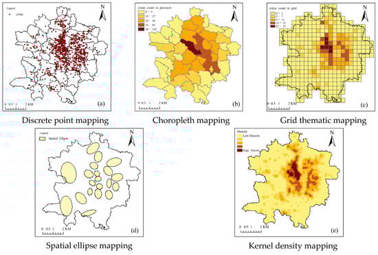 With the advancement of computers, crime mapping has become more detailed and sophisticated. Particularly, the introduction of ‘Geographic Information Systems pro-grams (GIS Program)’ alongside geography has had a significant impact on the design of crime maps. This allowed the overlaying of multiple layers of map data onto a single screen for analysis, enabling the analysis of factors such as the distance between crime locations and the residences of potential offenders, their movement paths, and surrounding environmental factors. Consequently, areas that were previously difficult to analyze became relatively easy to examine, leading to widespread adoption in both practical applications and research. Furthermore, web-based systems offer many advantages over desktop applications, such as easier and faster dissemination to a wider audience [13,14,15,16]. It ensures the use of up-to-date crime data for mapping and analysis by accessing centralized real-time updated crime databases. Figure 1 below illustrates representative types of crime maps using ArcGIS [13].