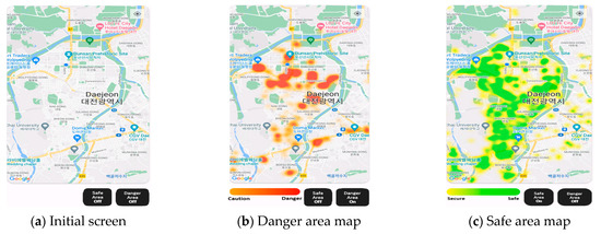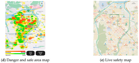 Firstly, this study conducted a density analysis of crime safety maps in Daejeon based on the heatmap of the data. The results of the analysis are shown in Figure 4 below. By toggling the black safety/danger area on/off button in the bottom right corner, the safety- or danger-area heatmap display on the map becomes visible. Firstly, (a) shows the Google Maps before executing the heatmap function. After turning on the “Danger Area” to confirm the danger area, the screen displays the density of danger areas as shown in (b). Dangerous areas are orange (caution) to red (danger) as negative facilities exist such as accommodation or adult entertainment, etc. In contrast, (c) displays the map where “Safe Area” is turned on to check the density of safe areas. Safe areas are displayed from yellow (secure) to green (safe) as positive facilities exist such as alert systems, police stations, etc. Both dark colored areas in danger and safe areas indicate regions where respective risk or protection factors are concentrated. Finally, (d) represents the map displaying both danger and safe areas. To give the application good usability, this study also checked the correlations of the safety index values with actual crime data. (e) Represent a live safety map of the same location distributed by the Ministry of the Interior and Safety, Republic of Korea [27]. It is visualizing the density of crimes that occurred in 2024, which indicated as red.