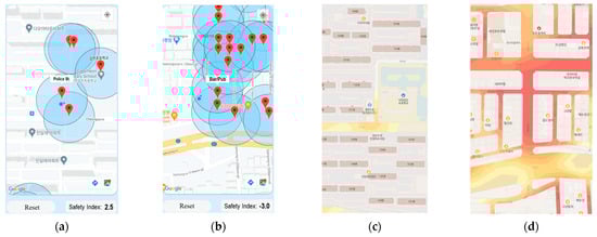Firstly, a heatmap is a visualization feature used to represent the intensity of data points at geographical locations [26]. By using and configuring a heatmap layer, a colored overlay is displayed on top of the map, allowing users to easily understand the distribution and relative intensity of data points on the map. In this study, a heatmap was created using the ‘Google Maps Android Heatmap Utility’, where areas with higher density of danger/risk are represented in red, and areas with higher density of safety are represented in green. The density of danger and safety area was calculated between 0.0 and 2.0 based on the South Korea Ministry of the Interior and Safety’s 2024 Regional Safety Index output indicator and weight [25]. It is the most appropriate indicator for a location’s situation, which is calculated and published annually by the Korean government. To be specific, in a safety area, security devices were weighted at 0.5, a school was weighted at 0.75, and a police station was weighted at 2.0. On the other hand, in a danger area, accommodation and entertainment venues were weighted at 0.75, and bars and adult entertainment establishments were weighted at 1.0.