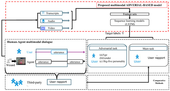 This study aims to investigate and mitigate the impacts that may lead to potential biases in the model of user rapport recognition for dialogue systems. Inspired by previous works [23,29], we examined the relationships between 18 rapport labels and users’ personal information. We subsequently employed an adversarial-based model designed to more effectively adapt to these personal information variations. An overview of this study is presented in Figure 2.
