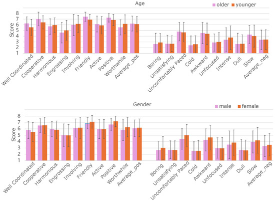 Figure 3 separately shows the average ratings of 125 participants for the 18-item post questionnaires consisting based on age (old/young) with the boundary set at 50 years old and gender (male/female) separately. The vertical axis denotes the mean user rapport rating. The horizontal axis represents the 18 questionnaire items, with the first nine items being positive labels. The overall average of the positive labels is displayed in the tenth position. Conversely, the remaining nine items are negative labels represented by tags that range from the eleventh to the nineteenth positions. The overall average of the negatively labeled items is shown at the right end of the horizontal axis. With respect to age, older participants tended to be more positive than younger participants in terms of sentiment-type rapport, such as friendly, active, positive, bored, and cold. In terms of gender, the female data were more sensitive and had higher standard deviations and means than the male data did for most labels, including positive and negative user rapport. Therefore, it is important to consider age and gender when recognizing a user’s rapport at the dialogue level.
