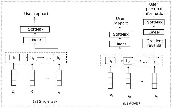 The loss of the ADVER base model can be defined as shown in Equation (5), where is the cross-entropy loss for the dialogue user rapport classifier, and is the cross-entropy loss for the users’ personal information classifier. These two classifiers were adversarially trained. Specifically, the model parameters for user rapport classification were adjusted to minimize , and the users’ personal information classification was adjusted to maximize . Minimax competition enhances the discriminability of user rapport, and suppressed the discriminability of users’ personal information, leading the model to converge to a state where the embeddings we extracted could recognize user rapport but could not correctly classify users’ personal information. Therefore, under ideal conditions, the embeddings we obtained were not influenced by users’ personal information.