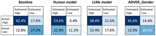 The confusion matrix of baseline, human model, instruction-based LLM model, and ADVER-Gender model for the engrossing label in the A + L feature set. (Darker colors represent higher values, and lighter colors represent lower values.).
