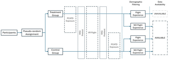 This research employs a quasi-experimental, pseudo-randomised, non-equivalent pre-test–post-test control group design with one direct intervention—prior PCATD-based simulator exposure—and one nuisance factor—prior flight experience. The research design uses both a pre-VR SSQ and a post-VR SSQ, which together form the basis of the primary change score data. As this design is a quasi-experimental approach, there are sources of invalidity that must be considered. Data were available for 85 (n = 85) participants, of whom 33 (n = 33) were in the PCATD exposure group, 25 (n = 25) were in the flight experience group, and the remaining 27 (n = 27) were in the control group. The flight experience group and the control group differed only in their prior airborne flight training as a nuisance factor. Demographic filtering was applied solely for the purpose of managing this nuisance factor—ensuring that the groups could be analysed based on prior flight experience. The original data, and the educational activities that produced these data, were solely for the purpose of an undergraduate laboratory course, which was conducted twice in a twelve-month period. The dataset comprised two separate course iterations, each lasting a single semester (i.e., six months). These data were anonymised prior to their provision to the researchers, as per the research ethics approval.