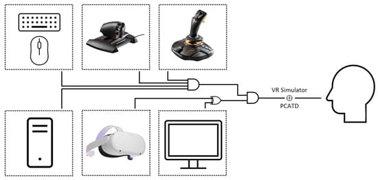 The simulator for the VR activity, shown in Figure 2, was based on a consumer-grade VR-HMD tethered to an existing uncertified PCATD. This PCATD was the system used for the associated intervention group. The computer that was used for the simulator ran the Windows 11 operating system, with an Intel i7 (2.5 GHz) central processing unit, 16 GB of DDR4 random-access memory, and an Nvidia RTX 3060 (16 GB) graphics card. The VR-HMD used was a Meta Quest 2 (formerly Oculus Quest 2), with two 1832 × 1920 p displays (one per eye) with a maximum refresh rate of 90 Hz and a lateral field of view of approximately one hundred degrees. The displays are arranged such that each eye receives slightly different images, resulting in the experience of depth and immersion within the computer-generated scene [61]. The VR-HMD was running a relatively recent version of its operating system (version: v61) and was compatible with the graphics card [62]. The VR-HMD was tethered to the PCATD via a supported USB Type-C cable (USB3.2 gen one—signalling 5 Gbps). The PCATD visual system consisted of a 27-inch flatscreen computer monitor with a resolution of 1920 × 1080 p, at a 60 Hz refresh rate. The X-Plane 11 flight simulator software ([63], version 11.20, Laminar Research, Columbia, SC, USA) was used, with graphics settings at medium. The aircraft used for the VR and the PCATD intervention groups was the Cessna 172, equipped with a Garmin G1000-style flightdeck (Guillemot Corporation, Chantepie, France). Identical flight controllers were also used—specifically, the Thrustmaster T.16000 HCS HOTAS [64].