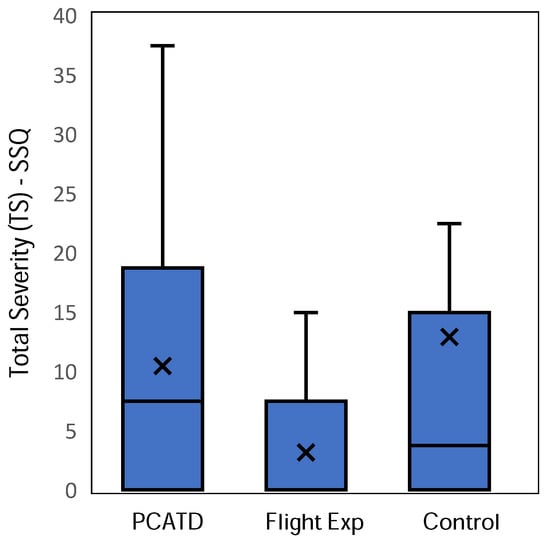 The change score of the TS of the SSQ for the control (M = 12.882, SD = 20.096, Md = 3.74), real-world flight experience (M = 3.142, SD = 5.142, Md = 0.000), and PCATD-based simulator exposure (M = 10.427, SD = 11.518, Md = 7.480) groups required assumption checking prior to primary statistical testing. The change score of the TS for each group is shown in Figure 4. Testing by Shapiro–Wilk showed that the distributions of the data for the control group (W = 0.669, p < 0.001), flight experience group (W = 0.656, p < 0.001), and PCATD group (W = 0.843, p < 0.001) all differed significantly from normality—as is common and expected for data of this nature [78,79,80]. Levene’s test (FLevene(2,82) = 6.635, p = 0.002) was used to check for homogeneity of variance, with the data found to be heteroskedastic. Given the results of the assumption testing, statistical testing proceeded with the non-parametric Kruskal–Wallis test and associated Dunn post hoc test.