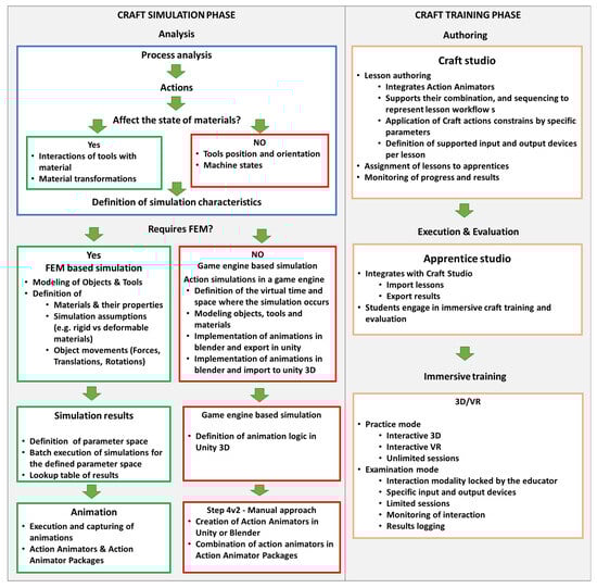 Regarding FEM-based simulation time, space, tools, and materials, it is initially defined in a FEM modeling tool. Object movements, material properties, and force interactions are modeled to accommodate both rigid and deformable material behaviors. The outputs of the execution of these simulations are preprocessed to generate results that explore the parameter space. These results are organized into lookup tables with key values in the domain of the parameter space. In the animation phase, the implemented lookup tables are used to create animations per lookup table key value. These animations are all combined into Action Animators which are collections of animations per action. Multiple Action Animators are combined into Animation Packages. Each Animation Package represents a complex craft process of a craft instance according to the complexity of the craft under study.
