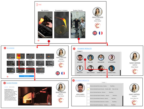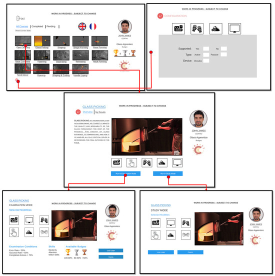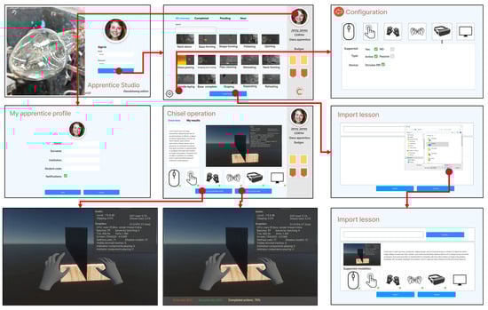 In Examination Mode, the student transits from practice to formal evaluation. Here, the lesson parameters are used to assess the student’s ability to perform the craft task accurately and within the predefined restrictions. The examination mode differs from the study mode in that feedback is withheld during execution, requiring the student to rely on their knowledge and skills developed in practice. Metrics are used to generate a quantitative score, representing the student’s proficiency in the craft action being evaluated. After completing an examination, the system provides the student with a detailed report of their performance. The Apprentice Studio’s design has been conducted in Figma UI design [142] service and then was imported into Unity3D [143] (see Figure 2). When entering the Apprentice Studio, the splash screen contains the collection of courses assigned to the specific student. Courses are categorized by their completion status.