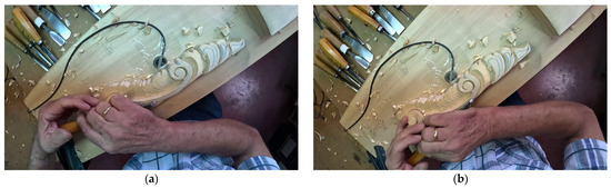 For the Analysis step, an example from the segmentation of an ethnographic recording is presented. This example consists of part of the recording of the craft process and the action under investigation regards creating a woodcarving design using a chisel. The segment concerns an Egocentric camera recording of the second practitioner contributing to the ethnographic analysis and has a length of 11’29. It presents the action initiation and the action iteration to create a horizontal wood carving. The process starts at the work table, where there is a piece of wood clamped into the working bench. The action under investigation regards the creation of a wood trim following the pattern of the object created. The action is performed with a solid tool (a sharp scalpel). The action is segmented to isolate the carving action (see Figure 3). Following the above-mentioned segmentation and documentation process, the ethnographic analysis provides a good understanding and video representation of the craft under investigation.