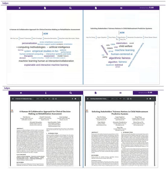 To cite an example, ref. [22] only visualizes each document’s derived topics and concepts in a 2-D visualization canvas. Therefore, textual content, figures and tables, bibliographic information and other important information of the documents should be extracted from other sources. This lack of ability to penetrate the inner layers of information may result in gaps between users’ mental models and external representations [23]. Encoding a large subset of information derived from a collection of scientific documents may result in researchers’ inability to navigate properly through the visualizations and answer the information needs during the sensemaking process. Reading textual content of documents, discovering semantics-based relationships, comparing documents, and articulating hypotheses about the studied scientific documents are time-consuming and challenging activities to be supported by VASs.