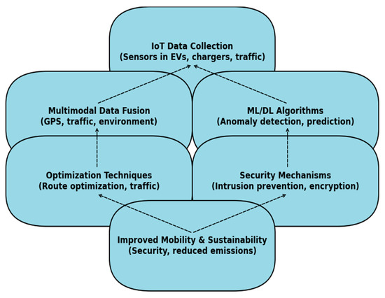 The system receives multimodal inputs from IoT nodes (e.g., EV sensors, traffic systems), processes them through AI models, and uses fused outputs to support optimized traffic routing and energy-aware mobility decisions [18,19].