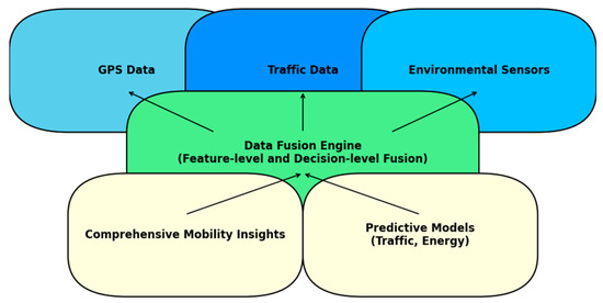 Figure 2 illustrates the role of the data fusion engine in our framework, combining heterogeneous sources such as GPS trajectories, traffic flow data, and environmental sensor streams to generate predictive mobility insights and support real-time decision-making.