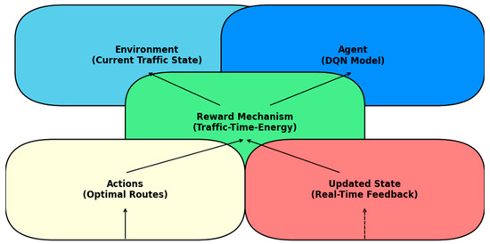 AI techniques, including machine learning (ML), deep learning (DL), and reinforcement learning (RL), enhance route optimization, traffic forecasting, and congestion management by integrating heterogeneous data from traffic, environmental, and vehicle sources [7,8,9]. Unlike static rule-based systems, RL enables continuous policy adaptation in dynamic traffic environments, improving sustainability outcomes.