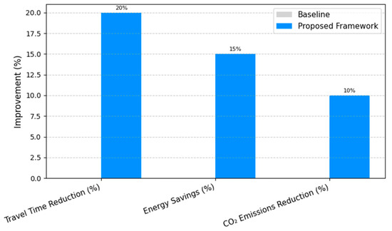 The modular architecture of the proposed framework supports diverse smart city operations. Table A2 provides selected highlights from simulated use cases, covering electric mobility, public transit, emergency response, and smart grid coordination. These results demonstrate real-time performance, AI responsiveness, and cross-domain adaptability.
