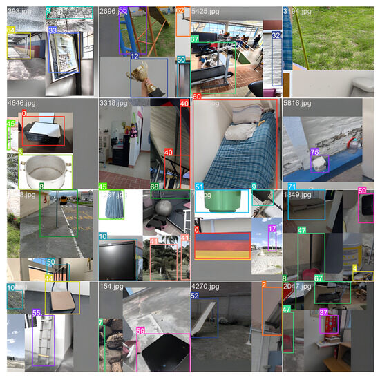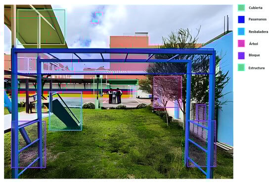 As mentioned above, the Detectra dataset consists of 7600 RGB images of 1024 × 1024 pixels. The dataset contains 76 classes such as Furniture, Ball, Door, Tree, Chair, Slide, and so on. The dataset classes are listed in Table 2. Each image contains 3, 4, or 5 common obstacles within the Educational Unit, as shown in Figure 4. Each class appears in 100 images. In order to determine which objects should be classified as obstacles, we conducted interviews with both visually impaired students and faculty members at the Dr. Luis Benavides Specialized Educational Unit. These interviews provided first-hand insights into the specific environmental elements that pose real challenges during daily navigation, such as stairs, open doors, chairs, and misplaced objects. Based on this input, we annotated our dataset to include only those items that were consistently identified as potential hazards. This user-informed approach ensures that the detection model focuses on obstacles that are both contextually relevant and practically significant for the target users.