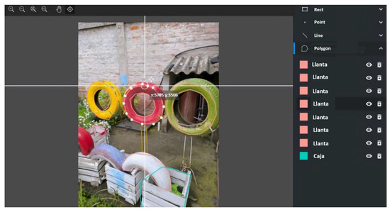 The images need to be tagged with the present objects, and this process involved defining and labelling the objects of interest, specifically the obstacles in the Educational Unit, using the Make Sense tool. To improve accuracy, the polygon function was used, allowing for the precise contouring of objects, especially in complex scenarios with irregularly shaped or partially hidden obstacles, as shown in Figure 2. This ensured higher-quality training data for the YOLO model.