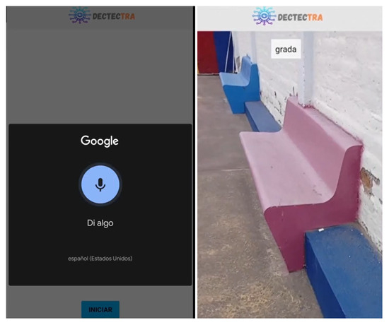 The mobile app interface design opted for has a simplified structure with only two screens. The first screen welcomes the user, and facilitates a brief initial interaction with the app; the second screen displays the images captured by the camera in real time, using the YOLO integration for object detection. Figure 3 shows the mobile application’s user interfaces, considering that the principal interaction mechanism is the user’s voice.