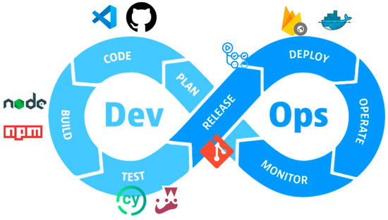 For the development of this project, an iterative and incremental methodology was used, as well as various technologies that contributed to the software development cycle. This combination of methodologies and tools allowed for an agile and efficient development process, ensuring the quality and functionality of the final product. The iterative and incremental methodology is an agile approach to software development; it is based on repeated development cycles (iterations), in which the product is improved and expanded incrementally. Each iteration includes planning, design, implementation, and testing phases. This approach allows for rapid adaptation to changes and continuous improvement of the product [25]. The integration of technologies in the software life cycle was carried out following the DevOps philosophy [26], which promotes collaboration between development and operations teams to improve software delivery and quality. DevOps focuses on continuous automation, integration, and deployment, facilitating the rapid and reliable delivery of software. Figure 2 shows the technologies that were used during each stage of the DevOps cycle.