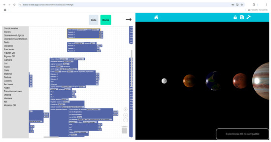 Looking forward, several areas for improvement and expansion have been identified. The invaluable cooperation of multiple educators has been important in the design and development of BabloXR. Nonetheless, it is believed that the project might gain from an assessment by a group of educators who are not part of the research team. It is suggested that future work on the application expand the block library with additional components, like predefined scenes and templates, to facilitate the rapid creation of educational environments by teachers; the importation of custom 3D models; the creation of integrated interactive tutorials to enhance accessibility; the integration of generative artificial intelligence; and the implementation of online collaboration features that enable multiple users to work simultaneously. These enhancements would further solidify BabloXR as a powerful and versatile tool in the field of XR-based education.