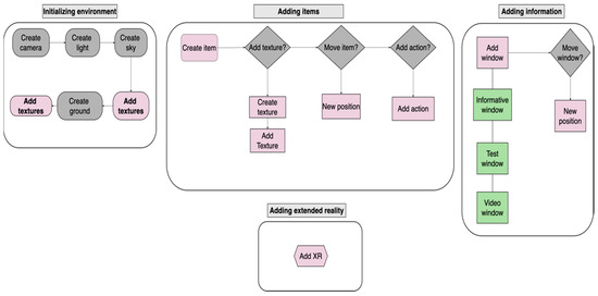 Figure 4 illustrates the workflow to construct an XR learning environment using BabloXR. This workflow has four main stages: initializing the environment, adding elements, incorporating information windows (optional), and creating the XR experience. Each of these stages is detailed below: