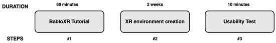 Figure 6 shows the evaluation process of BabloXR. First, a 60 min tutorial was presented to participants explaining the platform’s function. In this step, the tutorial was accompanied by a video on the YouTube platform that provides a detailed explanation of how to create a learning environment. Subsequently, test subjects were asked to develop their own XR environment within a two-week period. Within these two weeks, the authors of the BabloXR tool offered direct advice in person or via email for subjects who had encountered problems while creating their XR application. Finally, to measure the usability of the authoring tool, a questionnaire was applied, where participants spent 10 min providing their responses. In this last step, participants also were asked to answer a group of three open-ended questions about their experience using BabloXR.
