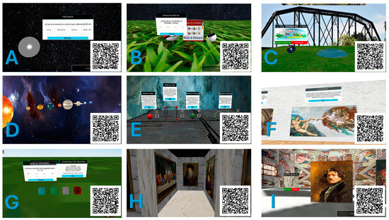 Figure 7 illustrates examples from the main interfaces of XR applications created by participants in the evaluation. Figure 7A shows the application created to teach how to calculate the area of a circle; Figure 7B shows the application created to teach how to use the elimination method in linear equations using a Pokémon theme. Similar XR applications are shown in Figure 7C, which describes the water cycle using a demonstration video. Figure 7D shows the solar system, where clicking displays relevant information about each planet; Figure 7E presents an environment in which the evolution of atomic models throughout history is explained; Figure 7F shows an art gallery; Figure 7G shows a grass field environment with four cube blocks with different textures, where each block serves a distinct purpose in relation to fractional operations; Figure 7H displays an art gallery with different paintings from the renaissance age; they also contain a small description of each one; and, finally, Figure 7I illustrates the works of art made by Eugène Delacroix.
