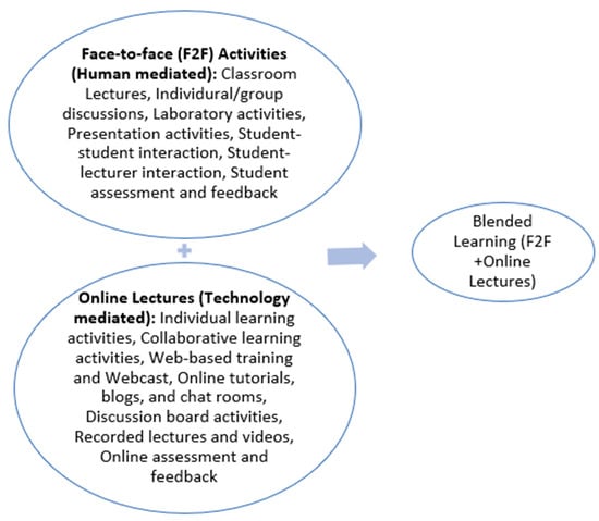 Blended learning has various initiatives that combine 30% of face-to-face interaction with 70% of IT-mediated learning [18]. In the same way, ref. [19] recommended integrating 20% face-to-face teaching with 80% online learning for successful blended learning. Thus, blended learning has many approaches and delivery models.