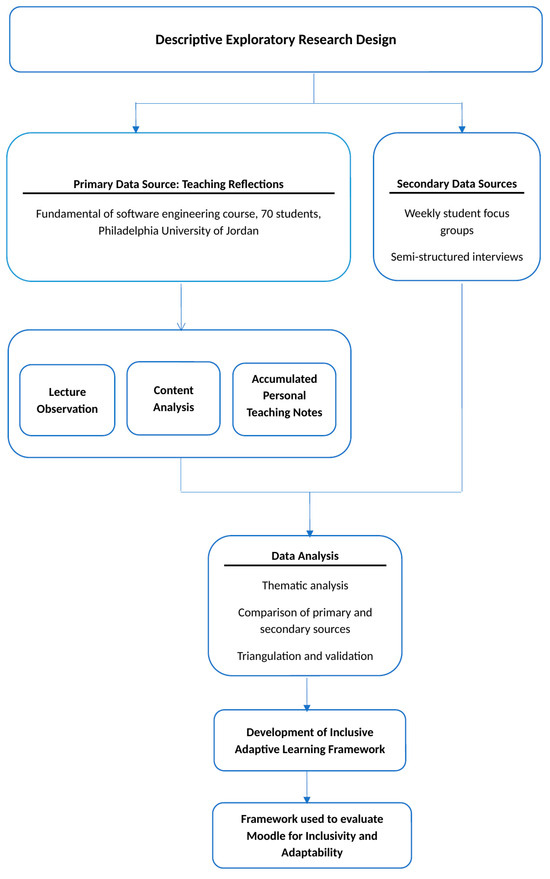 We adopted a descriptive exploratory qualitative design to investigate how Moodle can be utilized to achieve inclusive and adaptive learning in the context of higher education in Jordan. Such descriptive exploratory design is suitable for this unexplored area of educational technology where the goal is to understand a phenomenon from participants’ perspectives to generate a framework [48]. Figure 2 shows the research design approach, which incorporates reflective and thematic analysis, content analysis of course design, and thematic analysis of educators’ and students’ feedback. This multi-method qualitative approach allows for triangulation across different sources, which enriches the context and increases its depth and flexibility [49].