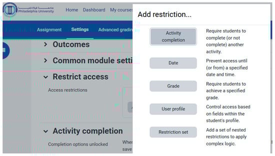 Adaptive learning aims to provide learners with the tools they need to learn based on their particular cognitive characteristics and needs [6]. The authors of [6] also added that it is crucial to consider the learners’ current level of knowledge as well as individual demands and variations in learning styles. Moodle is one of the tools for implementing adaptive learning. Although it is not inherently adaptive, it is possible to design adaptive activities within Moodle. It offers a variety of adaptive learning solutions, allowing educators the resources they need to support learners at every step of the learning process, from content delivery to assessment [6]. For example, the authors of [6] demonstrated how Moodle is used at Borys Grinchenko Kyiv University and, therefore, how Ukrainian higher education institutions utilized Moodle to implement adaptive learning through the conditional release of content, role-based access, and analytics-informed decisions. Similarly, ref. [4] noted that Moodle’s flexibility fosters a more student-centered learning environment when appropriately configured.