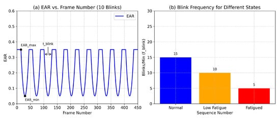 The EAR normalizes vertical eye height by width, mitigating variations due to head tilt or camera distance. To capture temporal dynamics, we analyze a sequence of 10 consecutive blinks (approximately 10–15 s), extracting four features: