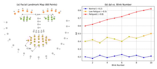 Facial expressions provide contextual cues about fatigue, such as drooping features or reduced mobility. We compute Euclidean distances between key landmark pairs per frame: