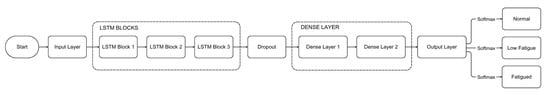 (2) Fatigue Assessment Module: Employs a Long Short-Term Memory (LSTM) neural network to process sequential facial parameters, classifying fatigue states into three categories: normal, low fatigue, and fatigued. This module leverages the temporal nature of fatigue indicators, distinguishing it from static classification approaches.