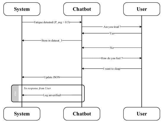 If the user responds negatively, the chatbot follows up with the question, “How do you feel?” to gather additional context. The user’s response, such as “I want to sleep,” is compared against a predefined knowledge base using cosine similarity on pre-trained word embeddings. This knowledge base contains categorized entries, such as phrases associated with low fatigue (e.g., “I want to sleep,” “falling asleep,” “eyes closing”) and normal states (e.g., “I’m fine,” “just focused”). If the response matches an entry, the prediction is adjusted accordingly; otherwise, the chatbot initiates further queries to clarify the user’s state.