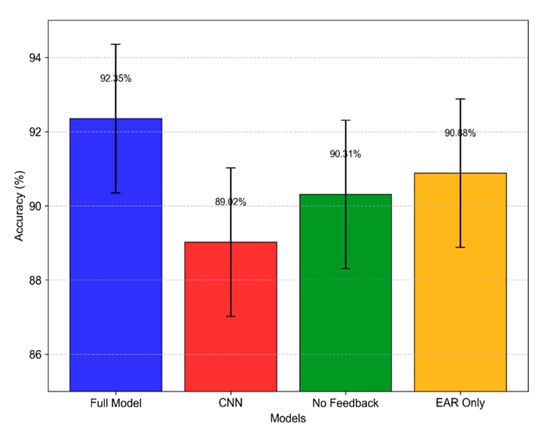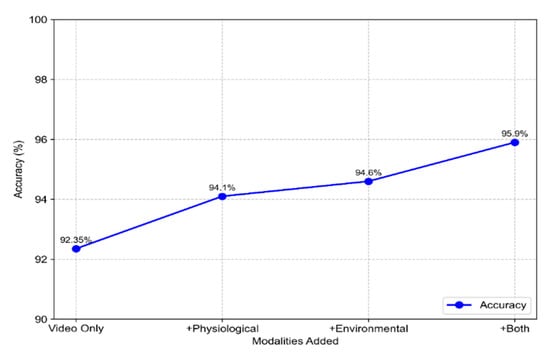 Our ablation study suggests that adding such features could boost accuracy beyond the current 92.35%, as the EAR—only variant (90.88%) already showed improvements when facial dynamics were included. Preliminary simulations indicate that the inclusion of physiological data could raise accuracy to approximately 94.1%, while environmental inputs alone might reach 94.6%. Combining both modalities potentially boosts accuracy to 95.9%, as shown in