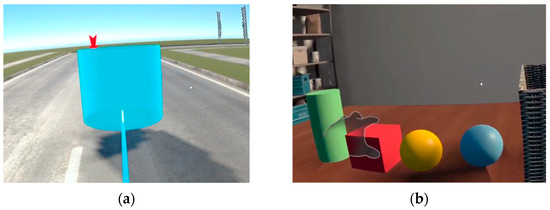 Participants engaged in four VR interaction techniques: two locomotion methods (teleportation and step) and two object selection/manipulation methods (hand-tracking and controller). Each technique involved at least five trials, preceded by a brief guided practice. The locomotion task required participants to follow directional cues, presented as a red arrow, along a virtual road (see Figure 1a), while the object interaction task involved placing 3D objects from a desk to a basket (see Figure 1b). The VR environment was intentionally minimalistic and visually neutral to reduce sensory distraction. The overall session lasted approximately 30 min, with short breaks provided between techniques to minimize fatigue.