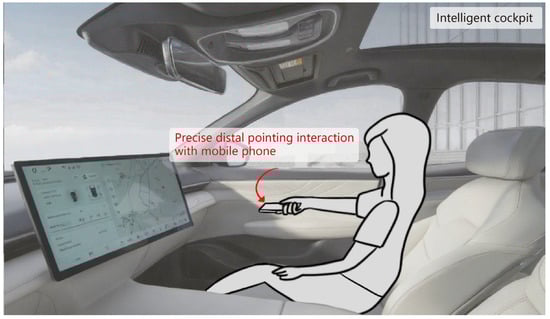 With the widespread application of immersive large screens, AR-HUD (Augmented Reality Head-Up Display), and multi-screen linkage systems in intelligent cockpits, the human–computer interaction paradigm within cockpits is undergoing a profound revolution. As the screen layout in intelligent cockpits extends from the driver’s seat to the entire front and rear rows, the interaction space has been expanded, generating demands for both passengers and drivers to control screens without physical contact. Additionally, due to the increased interaction distance, the operation distance has extended from the traditional 30 cm for touch control to 80 cm (for the central control screen) or even more. Traditional physical knob and button interaction methods have shown obvious limitations due to the increased functional complexity. In scenarios involving large screens and remote operations, touchscreen interaction requires passengers to lean forward, which can easily lead to uncomfortable postures and affect the user experience. Distal pointing, as an interaction paradigm that bridges physical space, enables long-distance object manipulation through gestures, eye movements, or device assistance. Due to its natural and intuitive characteristics, it is gradually penetrating diverse scenarios of intelligent cockpits and becoming a key technological direction for enhancing cockpit experience (see Figure 1).