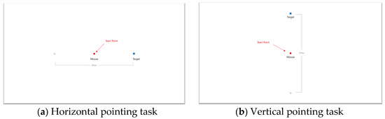 The study notes that many factors affect the performance and comfort of distal pointing interactions, including the user-to-display distance [11], target positions [12], CD gains, and control methods [13,14], etc. This paper explores research related to the CD gain and control mode, from the perspective of the input method in human–computer interaction.