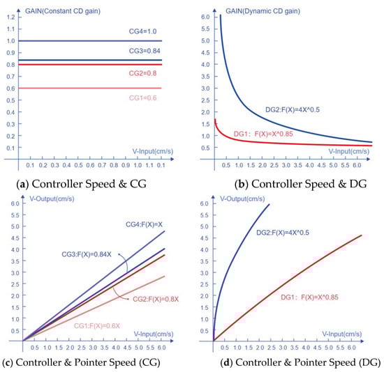 There are two sets of dynamic display gain (DG1, DG2). DG1(F(X) = X^0.85) represents where the speed of the display pointer increases slowly with the controller input speed (small gain rate of change), and DG2 (F(X) = 4X^0.5) represents where the speed of the display pointer increases rapidly with the controller input speed (large gain rate of change). These two functions were chosen in view of the fact that DG1 provides a smooth transition and DG2 enhances the response to high-speed movement. The relationships between different gains and the input speed of the controller are shown in Figure 3a,b, and the input speed of the controller and the output speed of the pointer under different gains are shown in Figure 3c,d. The value of the CD gains was taken with reference to existing studies, and a pilot study that included three participants. The selection was based on the relative superiority as reported verbally by the participants in the pilot study.