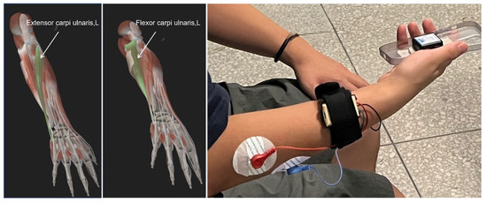 The Ergo Lab Smart Wearable Human Factors Physiological Recorder developed by Zinfar Technology was used to collect the EMG data of the relevant muscles of the participant in the process of accomplishing the task. The 2-channel smart wearable sensors were used for EMG data acquisition, as shown in Figure 4. To ensure the accuracy of signal acquisition, disposable bipolar surface electrodes were attached to the surface of each group of muscles in order to accurately capture the electrical signals generated by muscle activities [29].