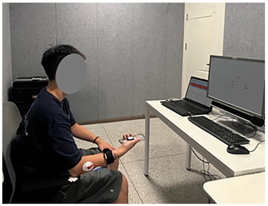 In order to simulate the posture of passengers using mobile phones for remote control in the intelligent cockpit, participants were seated 1.2 m from the screen during the experiment. The height of the seat was adjusted to a comfortable position according to the height of the subject during the preparation stage, and the seat was orientated in a fixed position with armrests. Participants were asked to place their elbows on the armrests at all times during the experiment, as shown in Figure 6. Participants performed all tests on the same Lenovo-equipped laptop (Lenovo Xiaoxin 15, Lenovo Group Ltd., Beijing, China), with the task interface displayed on an external monitor with a resolution of 1920 × 1080 and a refresh rate set to 60 Hz.