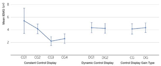 There was a significant difference between the mean value of the IEMG recordings of the participants in the four constant CD gain conditions (F = 36.903, p < 0.001). Further pairwise test analysis showed that there was a significant difference in IEMG values between the two pairs in the CG1, CG2, CG3, and CG4 conditions. The highest mean value of IEMG was found in the CG1 condition (M = 5.58, SD = 2.07), the mean value of IEMG was smaller in the CG2 condition compared to the value in the CG1 condition (M = 4.17, SD = 1.39), the lowest mean value of IEMG was found in the CG3 condition (M = 3.22, SD = 0.82), and the mean value of IEMG in the CG4 condition (M = 3.67, SD = 1.13) was bigger than for the CG3 condition. As the constant CD gain increased from 0.6 to 1.0, the mean value of IEMG showed a trend of gradually decreasing and then increasing, as shown in Figure 7.