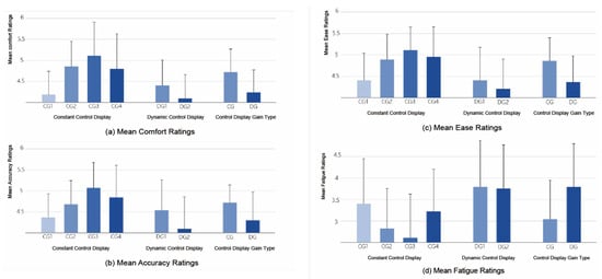 As shown in Figure 10, as the constant CD gain increases from 0.6 to 1.0, the perceived comfort, accuracy, ease and fatigue showed a gradual trend of getting better, with 0.84 being the best, and then getting worse.