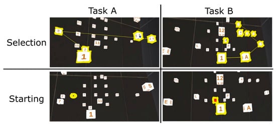 The tasks of the TMT-VR. Task A (Left), Task B (Right), starting position (Bottom), and selection of targets (Top). Figure derived from Giatzoglou et al. (2024) [33]. Protocol and procedures are identical.