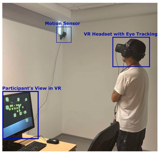 Participant performing TMT-VR using eye-tracking-based interaction. Figure derived from Giatzoglou et al. (2024) [33]. Protocol and procedures are identical.