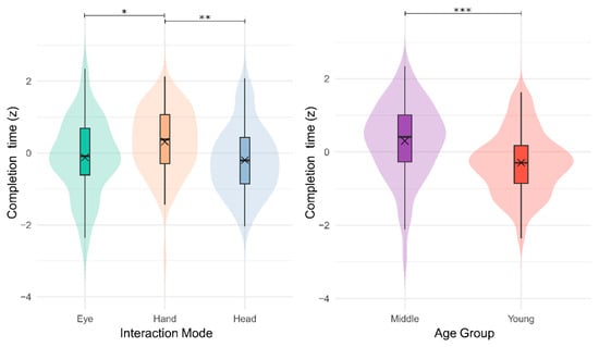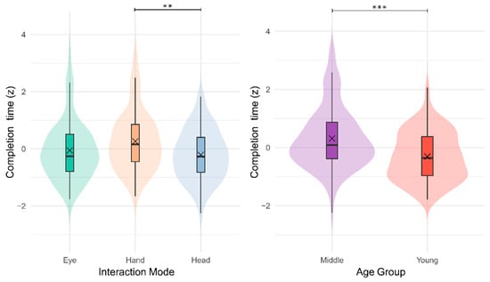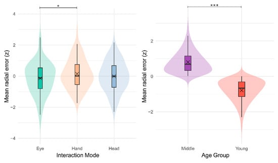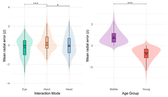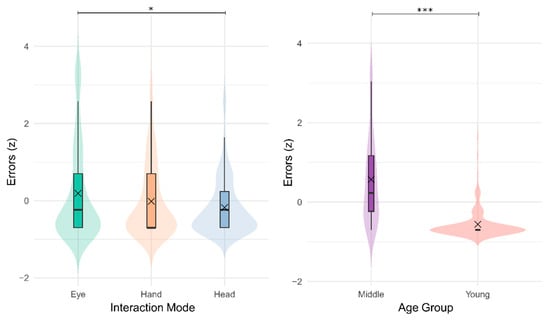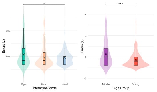 Post hoc (Bonferroni) comparisons clarified the modality effect. Eye-tracking yielded the lowest error (mean difference vs. hand-controller = −0.48 z), p < 0.001; Cohen’s d = 1.45 and was also more precise than head-gaze (−0.22 z), but p = 0.055 (see Figure 3). Head-gaze out-performed the controller (+0.26 z), p = 0.012. For age, middle-aged adults were dramatically less accurate than young adults (see Figure 3). Thus, while gaze-based input—especially eye-tracking—markedly enhances spatial accuracy, a substantial age advantage persists irrespective of interaction technology.