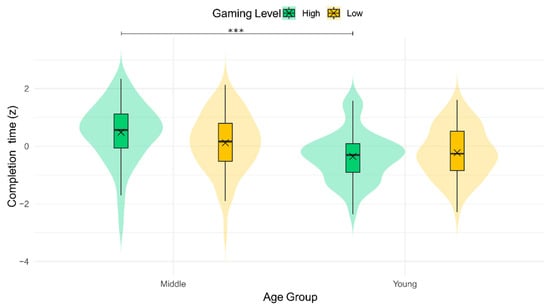 The mixed-model ANOVA again confirmed that spatial accuracy differed by Interaction Modality, F(2, 219) = 4.38, p = 0.014, η2p = 0.04, and—much more strongly—by Age Group, F(1, 219) = 410.30, p < 0.001, η2p = 0.65. Gaming experience exerted no reliable effect, F(1, 219) = 0.77, p = 0.38, η2p = 0.01, and none of the two- or three-way interactions approached significance (largest F = 0.79, p = 0.46, η2p ≤ 0.02).