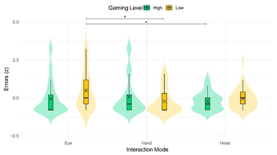 Primary hypotheses were tested with two 3 × 2 mixed repeated-measures ANOVAs implemented in afex [74]. Interaction Mode (eye-tracking, head-gaze, controller) served as the within-subjects factor, while Gaming Skill (high vs. low, median split) was the between-subjects factor—analysed separately for Tasks A and B. When sphericity was violated, Greenhouse–Geisser corrections were applied. Post hoc pair-wise contrasts were obtained with the emmeans package [75], using Bonferroni adjustment to maintain the familywise error rate. All effect sizes are reported as partial η2 (ANOVA) or Cohen’s d (post hoc comparisons), and statistical significance was set at p < 0.05.