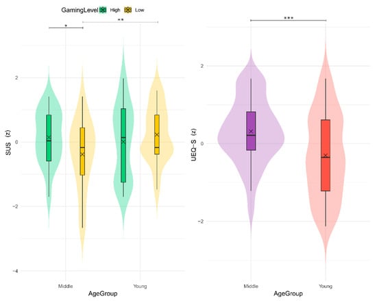 Immediately after completing the six experimental trials, participants removed the headset and filled out three paper questionnaires. Usability perceptions were captured with the System Usability Scale (SUS), a ten-item, five-point inventory whose robust factor structure and sensitivity to subtle interface flaws are well documented [64,65]. The short version of the User Experience Questionnaire (UEQ-Short) provided a multidimensional evaluation of user experience, asking respondents to rate 8 semantic differential pairs such as “obstructive–supportive” or “conventional–innovative” on a seven-point continuum. In the present data set, internal reliability for the attractiveness meta-factor was 0.89, while pragmatic and hedonic facets ranged between 0.73 and 0.82, aligning with published norms [66]. Acceptability was gauged with the ten-item public-use adaptation of the Service User Technology Acceptability Questionnaire (SUTAQ), which has demonstrated convergent validity with adoption intentions in prior VR health applications [67,68]. Items such as “The VR test would fit easily into my daily life” were answered on a six-point agreement scale; Cronbach’s alpha in this study was 0.82.