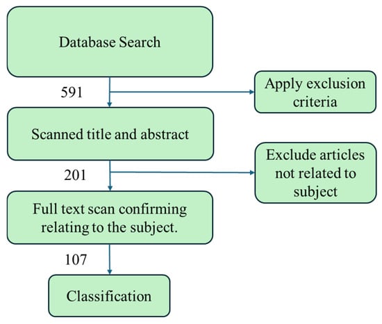 To enhance transparency and methodological rigor, the study selection process was documented using the Preferred Reporting Items for Systematic Reviews and Meta-Analyses (PRISMA) framework. A total of 591 studies were retrieved from the databases, and after removing duplicates and screening titles and abstracts for relevance, 201 full-text articles were assessed for eligibility. After applying the inclusion and exclusion criteria, 107 studies were included in the final analysis of this review. A PRISMA flow diagram summarizing the selection process is presented in Figure 1.
