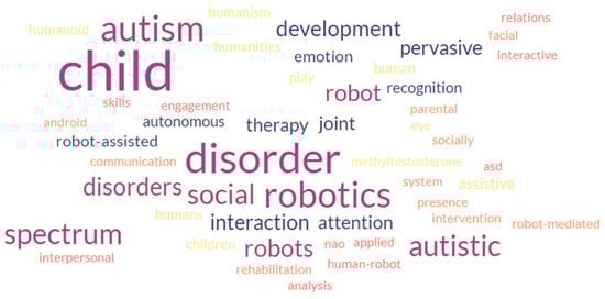 The word cloud in Figure 3 provides a visual representation of the major research trends in robot-assisted therapy for ASD, focusing on social engagement, autonomy, and assistive technologies. The prominence of terms related to emotion recognition, attention, and communication suggests a strong interdisciplinary approach that integrates AI, psychology, and human–robot interaction to improve ASD therapy outcomes.